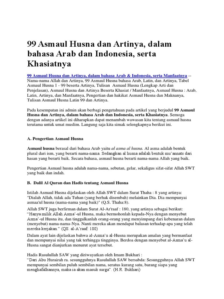 Dalam islam asmaul husna 99 nama allah mempunyai sembilan puluh sembilan kesemuanya yang terbaik. Setiap asmaul husna memiliki arti dan makna tersendiri . Asma'ul husna 99 nama allah dalam bahasa arab, rumi dan maksud serta penerangan dalam bahasa melayu. 99 asmaul husna arab latin beserta artinya /fathulghofur.com. Pautan kepada video youtube dan mp3 lagu/zikir asma'ul . Setiap asmaul husna memiliki arti dan makna tersendiri yang tentunya sangat baik.